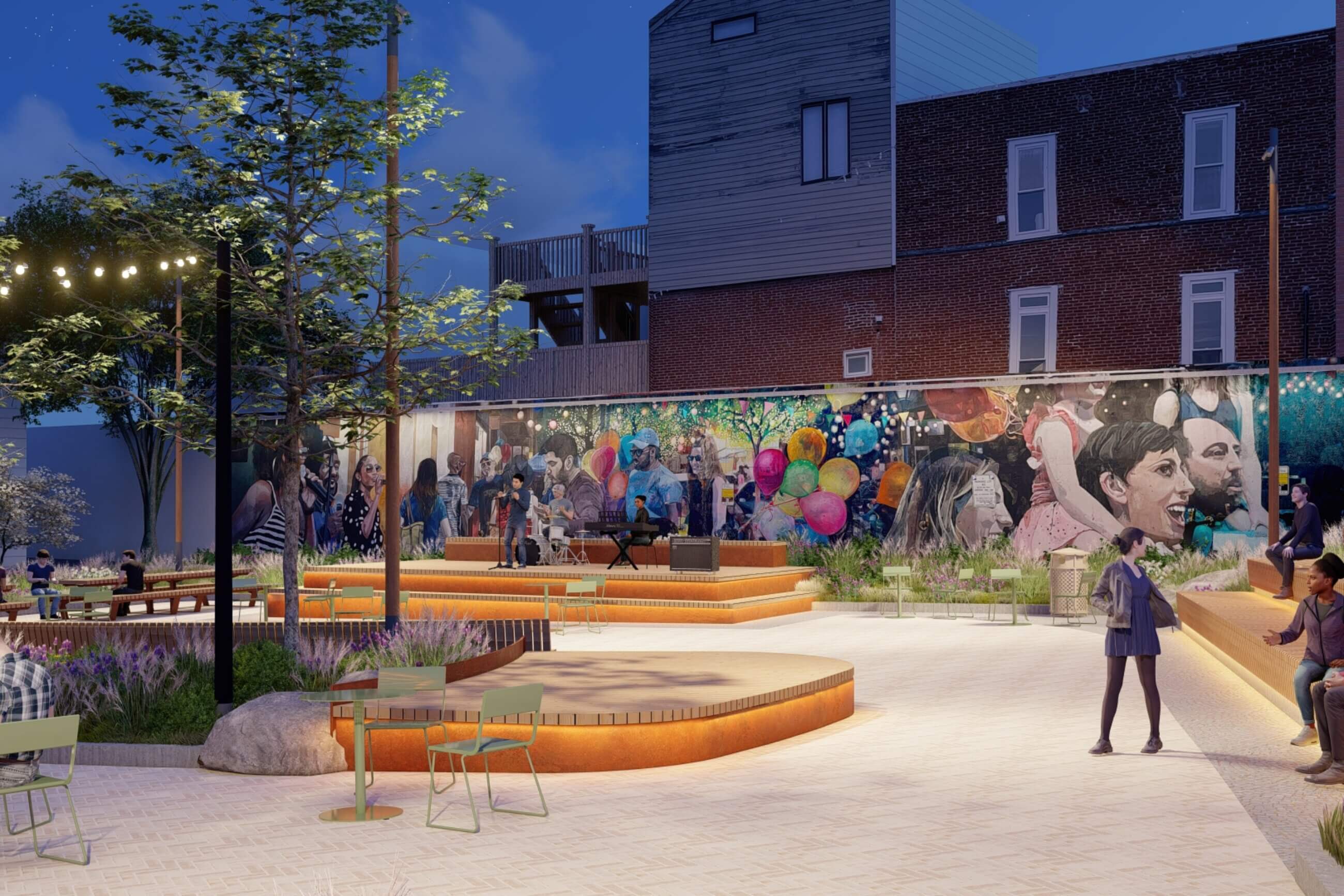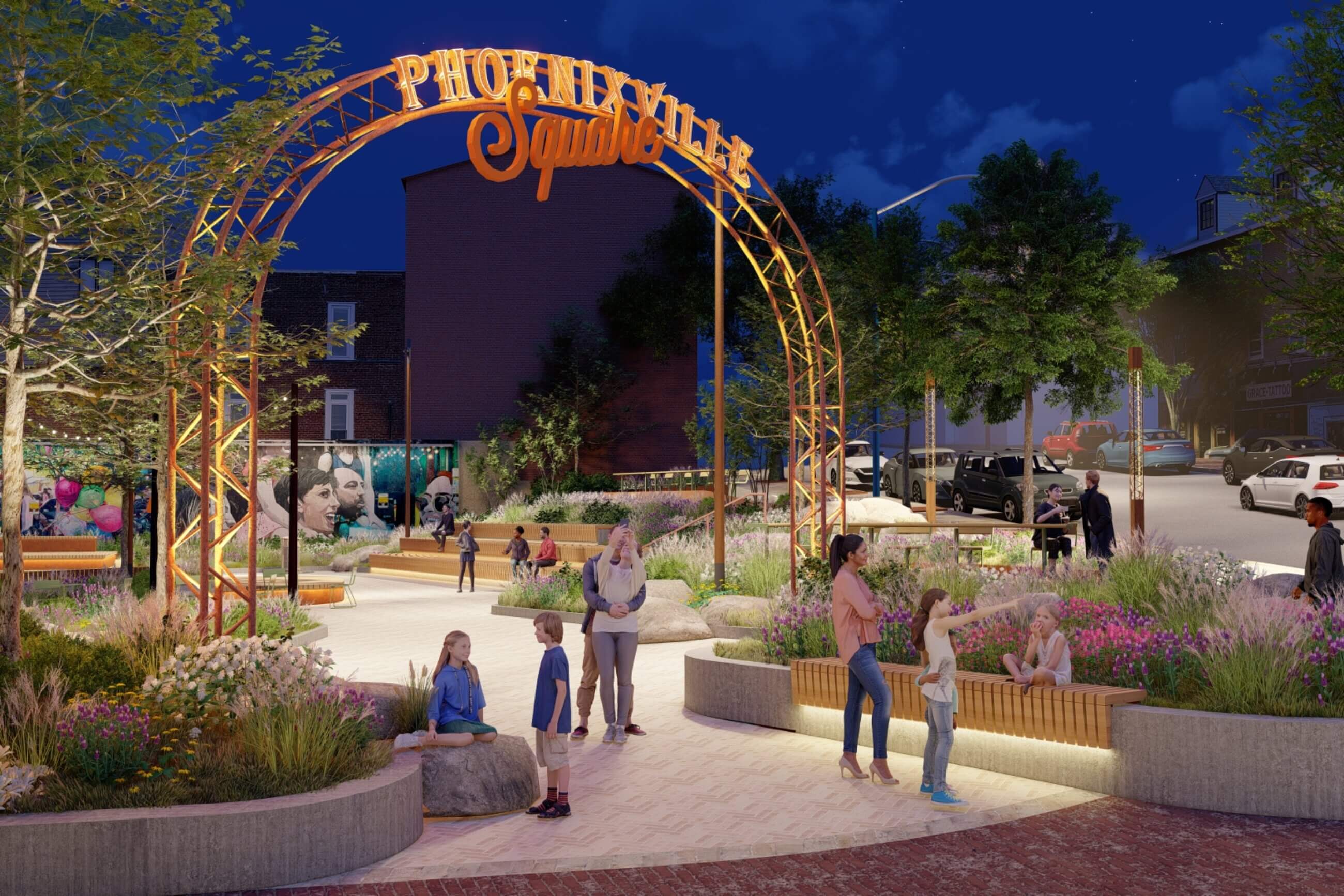 The design concepts for The Square at Bridge and Main are deeply rooted in Phoenixville’s identity and values. Guided by community input and local voting, the design reflects residents’ needs and aspirations, ensuring the space feels authentically theirs. Celebrating the town’s rich industrial heritage while creating a welcoming public gathering place, the project embodies the community spirit it was built to serve. The landscape and lighting design draw inspiration from Phoenixville’s storied iron and steel industry, the fluid motion of its rivers and creeks, and the warmth of its community pride and hospitality. What is now a parking lot will soon be transformed into a vibrant destination, a place for excitement, rest, relaxation, and connection. The Square at Bridge and Main captures the essence of the town’s past while illuminating its bright future.